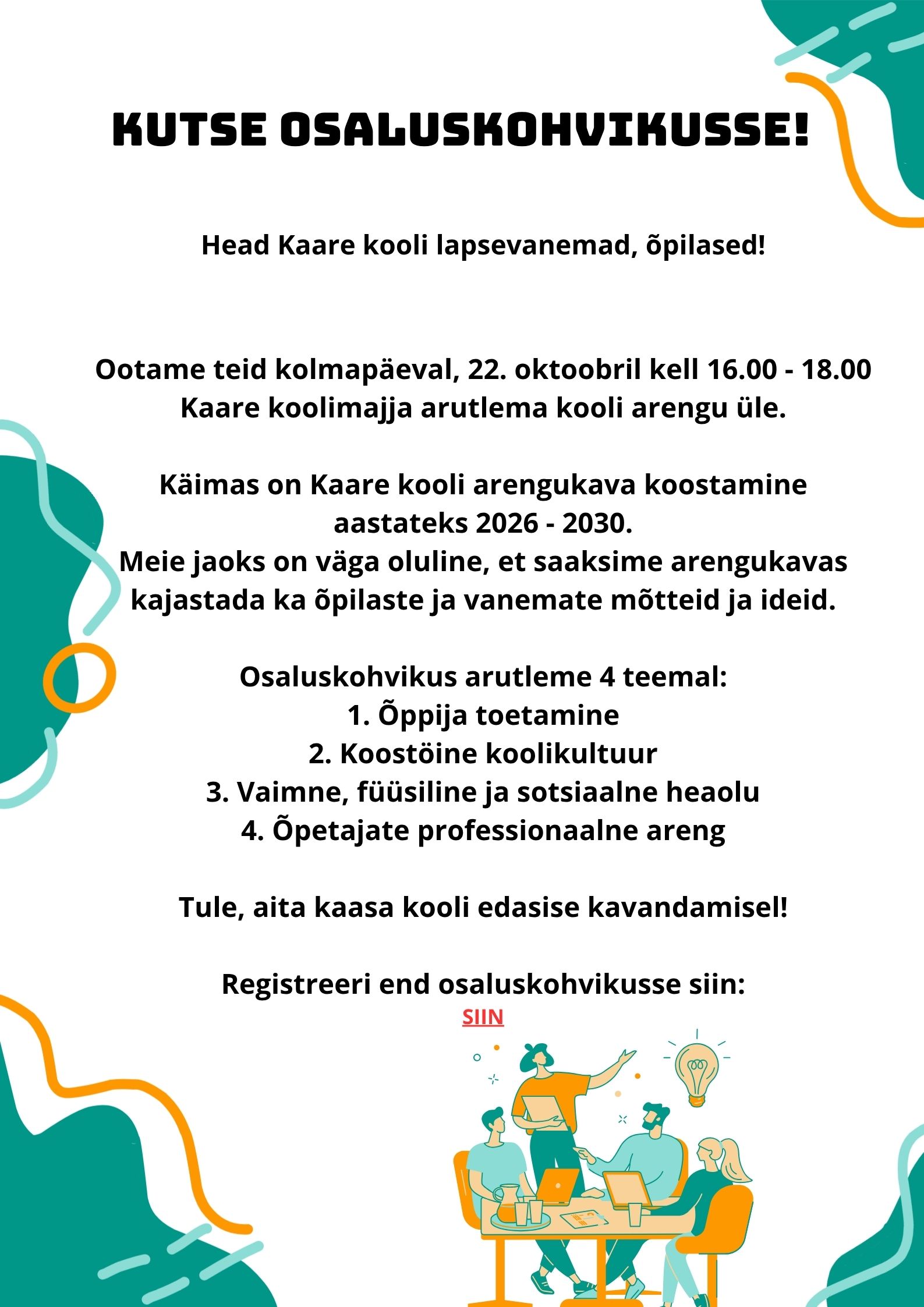 Ootame teid kolmapäeval, 22. oktoobril kell 16.00 - 18.00 Kaare koolimajja arutlema kooli arengu üle.