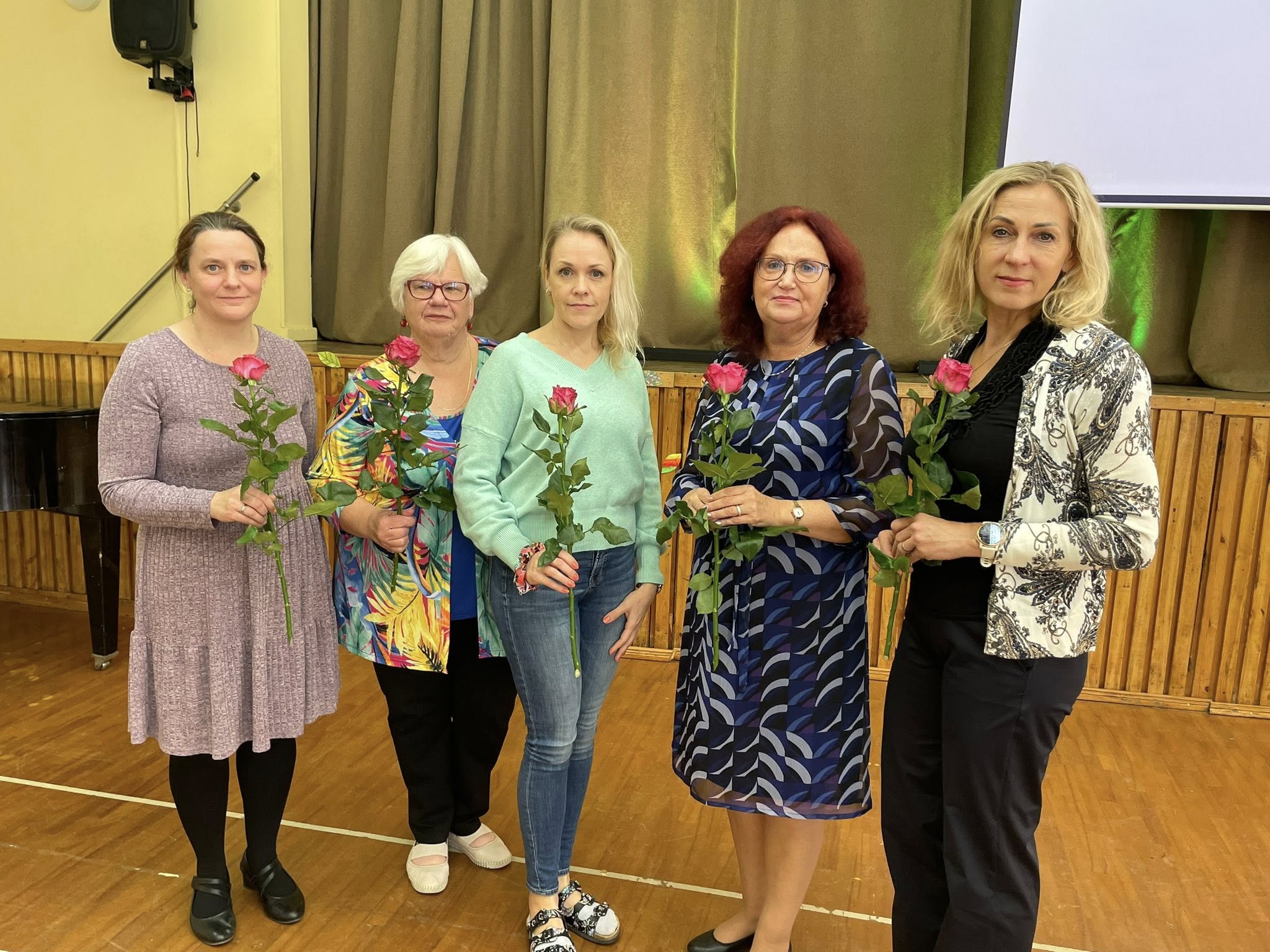 Fotol meie tööjuubilarid. Õpetaja Merlin, õpetaja Elo, õpetaja Kätlin, õppejuht Marika ja direktor Epp.