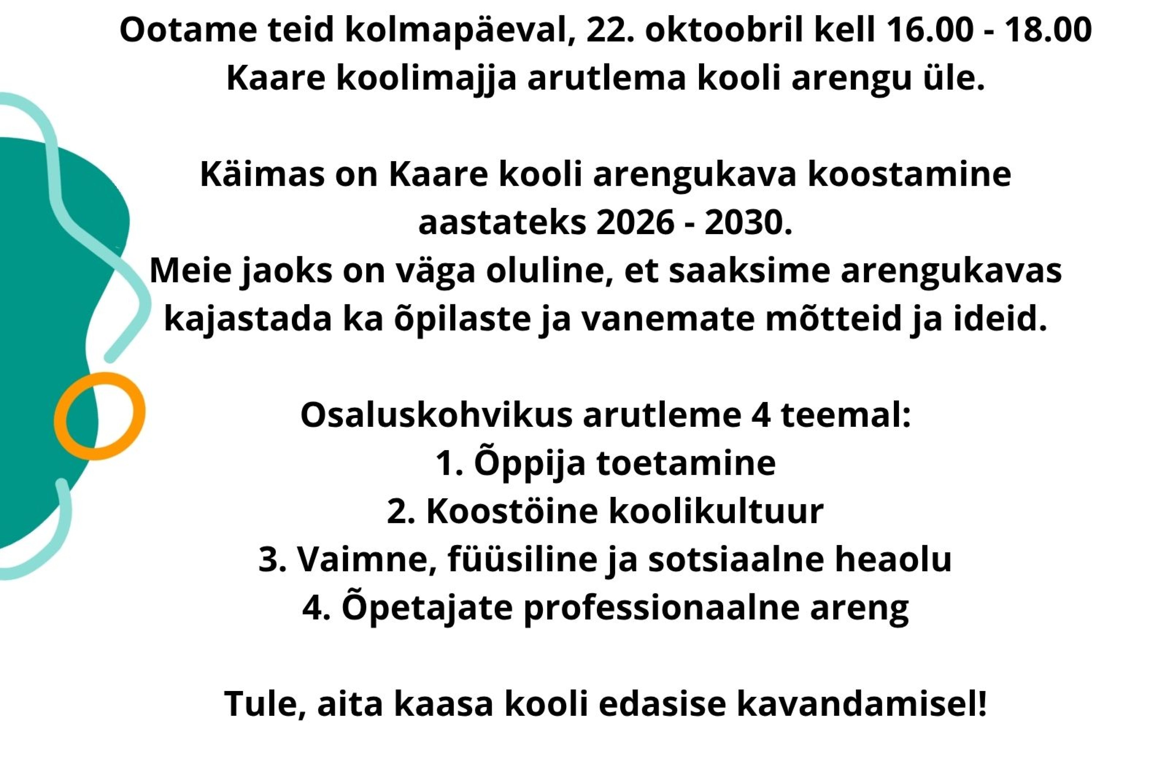 Ootame teid kolmapäeval, 22. oktoobril kell 16.00 - 18.00 Kaare koolimajja arutlema kooli arengu üle.